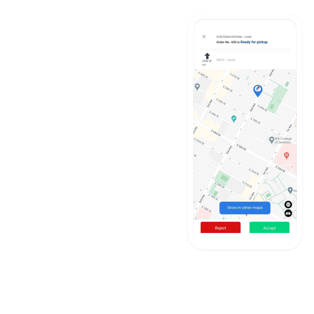 Abre tu app de navegación favorita directamente desde nuestra Driver App. Elige la mejor ruta, ahorra tiempo y entrega los pedidos a tiempo. Reduce los tiempos de entrega y mejora la satisfacción de tus clientes.